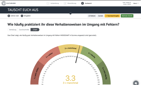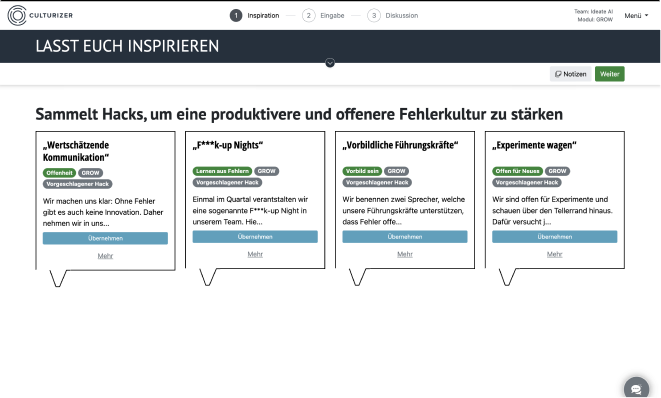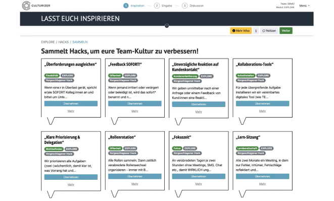 Der Culturizer ist so entwickelt, dass ihr eure Hacks, also Maßnahmen und Vereinbarungen sofort umsetzen und im Arbeitsalltag verankern könnt. Zusätzlich erhaltet ihr ein digitales Reporting, in dem ihr alle Inhalte und Ergebnisse des Workshops seht.
