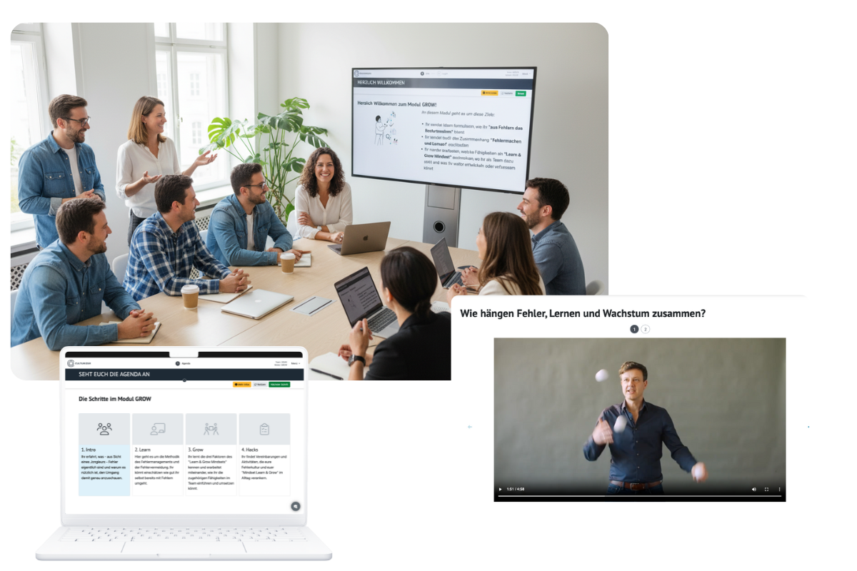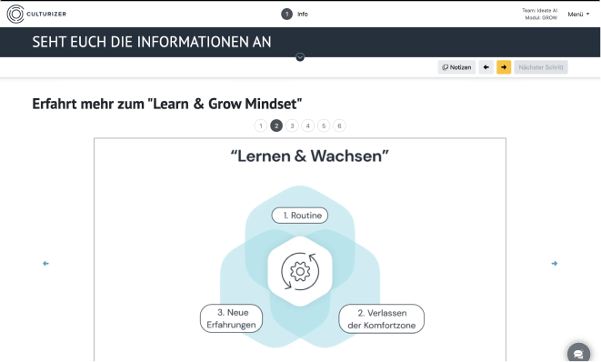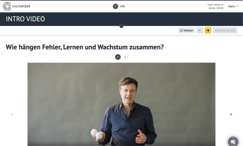 Seine einzigartige Perspektive, die er humorvoll und inspirierend vermittelt, macht Fehlerkultur greifbar und verständlich. Diese Expertise ist direkt in die Konzeption und die Inhalte des GROW-Moduls geflossen."Unsere Führungskräfte können ihre Mitarbeitenden mit dem CULTURIZER interaktiv und ohne externe Moderation in ihre Team Journey einbinden. Basierend auf unserer strategischen Initiative haben wir eine maßgeschneiderte Learning-Journey aus insgesamt 7 Workshop Modulen kreiert."